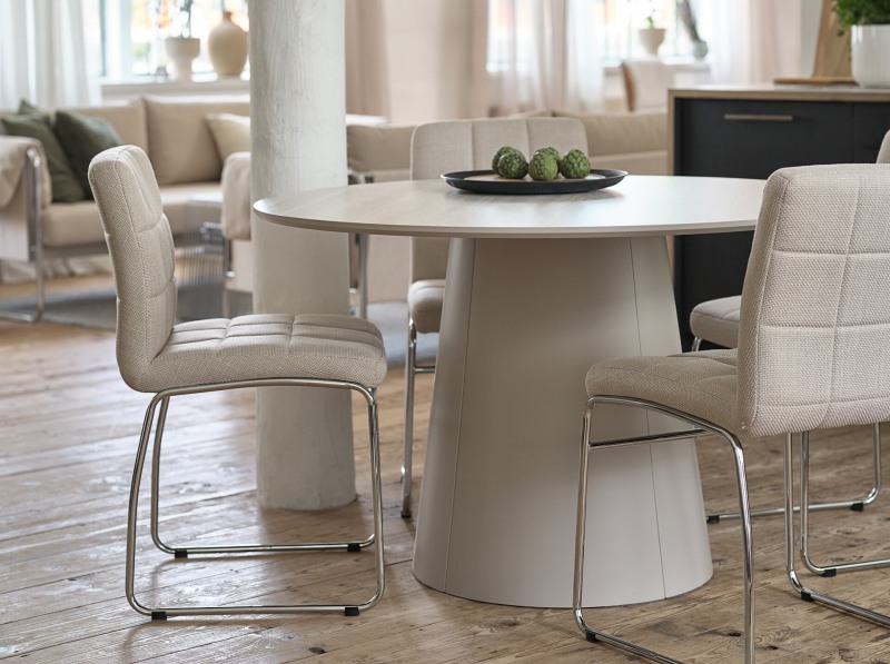Trong phòng ăn, Cloud Dancer mang đến vẻ đẹp của sự thanh khiết và chân thực. Một chiếc khăn trải bàn bằng sợi tự nhiên màu trắng ngà kết hợp cùng bộ đồ ăn gốm sứ FERDUS có bề mặt nhám mịn sẽ tôn vinh vẻ đẹp của món ăn. Tại đây, thiết kế tối giản đóng vai trò là khung cảnh, nhường chỗ cho những cuộc hội thoại và sự kết nối giữa các thành viên trong gia đình.