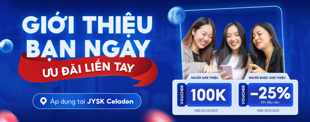 Bạn đã sẵn sàng trở thành Đại sứ JYSK để rinh về loạt ưu đãi siêu xịn chưa? JYSK Việt Nam mang đến chương trình GIỚI THIỆU BẠN NGAY- ƯU ĐÃI LIỀN TAY với hàng ngàn voucher mua sắm. Diễn ra tại JYSK Celadon (TP.HCM), đây là cơ hội để bạn và người thân yêu cùng làm mới không gian sống với ưu đãi cực hấp dẫn.