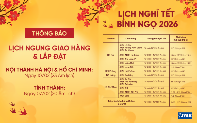 Để đảm bảo quý khách có một thời gian mua sắm thoải mái và thuận tiện, cũng như đảm bảo tiến độ vận chuyển trước kỳ nghỉ Tết Nguyên Đán Bính Ngọ 2026 sắp tới, JYSK Việt Nam xin trân trọng thông báo lịch nghỉ Tết như sau.