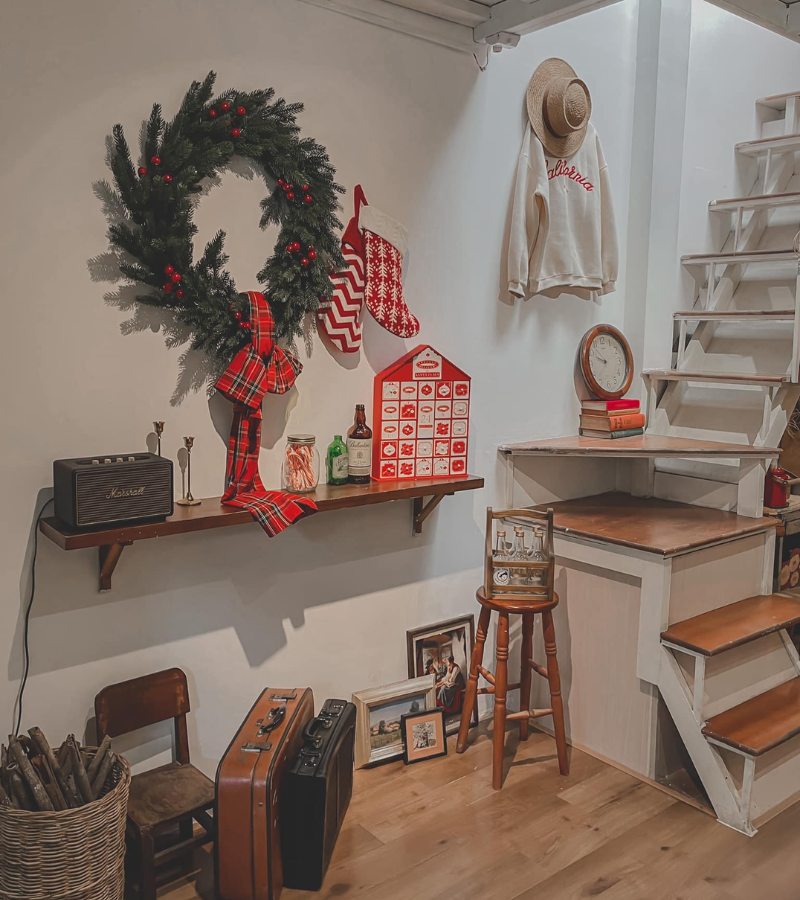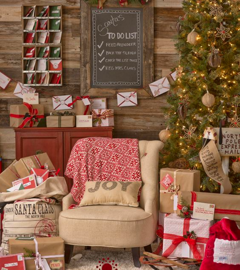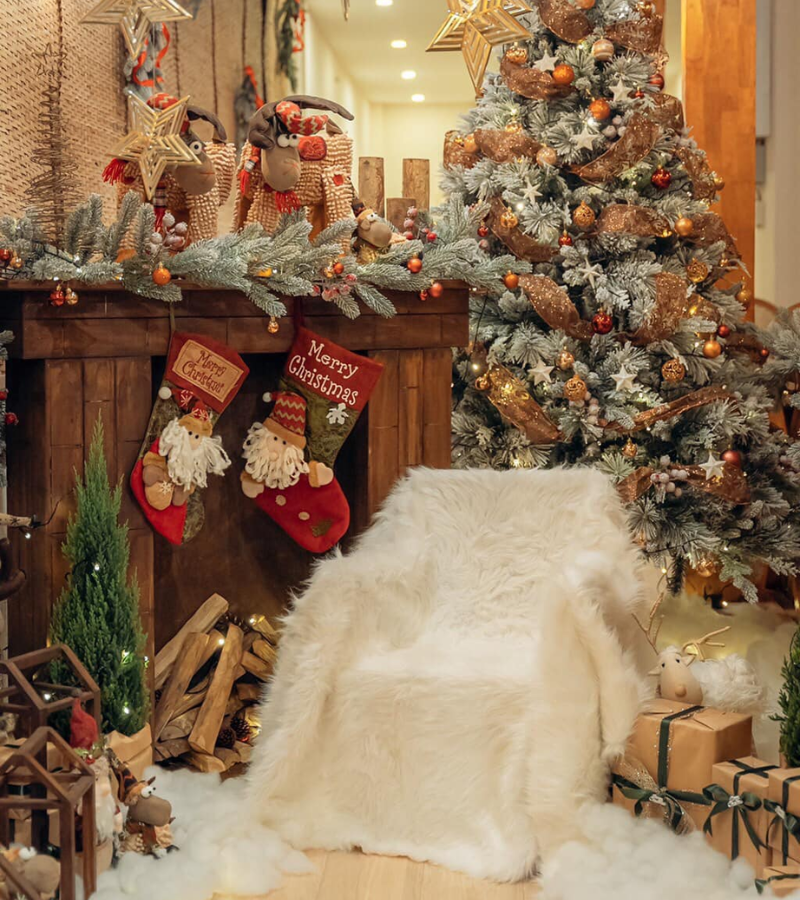 Những kệ tủ để đồ dùng hoặc đồ trang trí sẽ đẹp hơn khi bạn trang trí bằng một vài quả thông, hộp quà, vòng hoa trang trí, ông già Noel kết hợp đèn hay đặt thêm chiếc ghế đôn với thảm lông, gối trang trí,….