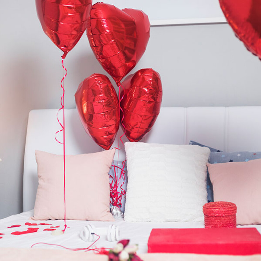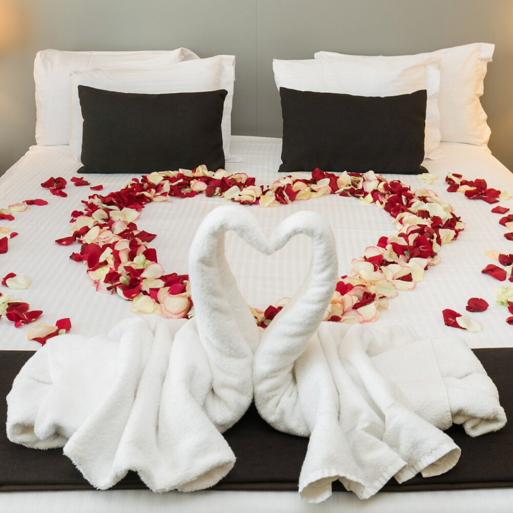 Nhắc đến tình yêu, chúng ta không thể không nhắc đến hoa hồng. Hoa hồng đỏ tượng trưng cho sự khởi đầu nhẹ nhàng, cho một tình yêu chân thành và nồng nàn. Vì vậy, bạn có thể dùng những cánh hoa hồng kết thành hình trái tim lớn trên giường tân hôn hay rải những cánh hoa hồng trong phòng ngủ để tạo không gian ấm áp và lãng mạn cho đôi uyên ương.