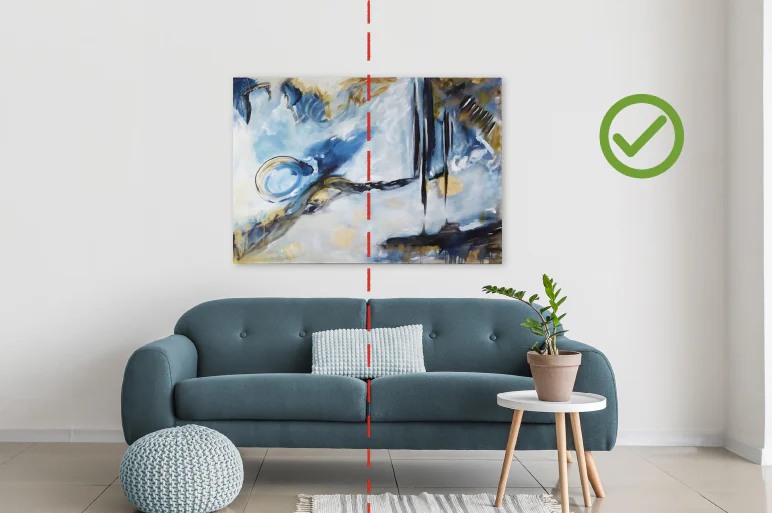 Tranh treo trên tường phải đảm bảo ngay ngắn, cân đối. Không nên treo quá cao hoặc quá thấp. Vị trí treo tranh hợp lý là ngang tầm mắt cửa người nhìn để thuận tiện cho việc quan sát toàn bộ bức tranh. Thông thường, tranh treo phòng khách thường được bày trí ở bức tường trống phía sau sofa. Khi kết hợp với các món đồ nội thất khác ở vị trí trung tâm vừa khiến bức tranh trở nên nổi bật, lại tính tế và nhẹ nhàng.