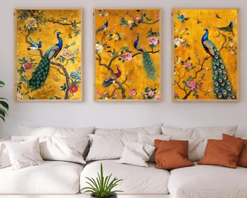 Đối với phòng khách lớn, ngoài những bức tranh khổ lớn, bạn có thể chọn tranh treo tường theo bộ. Đặc biệt là với những bức tường phòng khách có kích thước từ 2,5m trở lên. Những bức tranh có kích thước và hình ảnh khác nhau khi ghép lại vừa giúp cân bằng kích thước tổng thể, vừa làm đa dạng nội dung mà bộ tranh truyền tải.