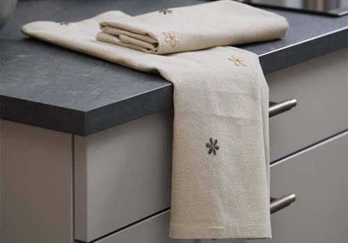 • Thiết kế tinh tế: họa tiết thêu nổi bật trên nền vải màu xám mang đến cảm giác thủ công tinh xảo và điểm nhấn thẩm mỹ cho không gian bếp.