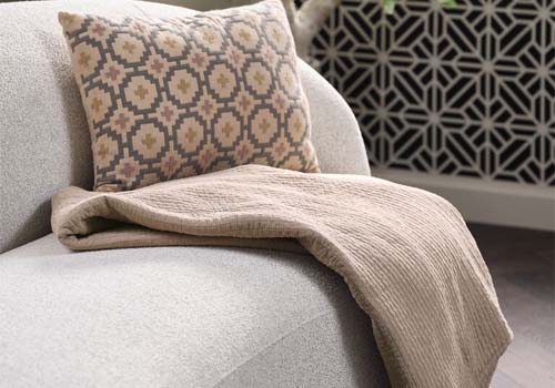 - Lợi ích thiết thực: cảm giác mềm mại từ cotton; ruột chăn từ polyester tái chế, tăng độ phồng; kích thước phù hợp cho sofa nhỏ đến trung bình.